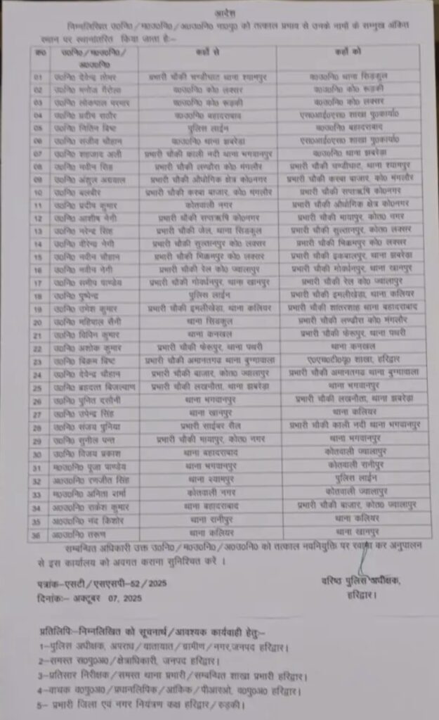 हरिद्वार, संवाददाता। हरिद्वार जिले में पुलिस महकमे में बड़ा फेरबदल किया गया है। एसएसपी प्रमेंद्र सिंह डोबाल ने आधी रात को 36 उप निरीक्षकों के तबादले कर दिए। इनमें से 18 पुलिस चौकियों के प्रभारियों को बदला गया है, जबकि पांच कोतवालियों के एसएसआई की भी अदला-बदली की गई है। #transfer इस रात्रि तबादला सूची को एसएसपी स्तर से जारी किया गया, जिसके कई मायने निकाले जा रहे हैं। बताया जा रहा है कि जिले में लंबे समय से कई चौकियों और कोतवालियों में कोई फेरबदल नहीं हुआ था। कुछ चौकी प्रभारी वर्षों से एक ही स्थान पर जमे हुए थे, वहीं कई स्थानों पर पद खाली चल रहे थे। अब इन सभी पदों पर नए अधिकारियों को जिम्मेदारी दी गई है। Breaking hub