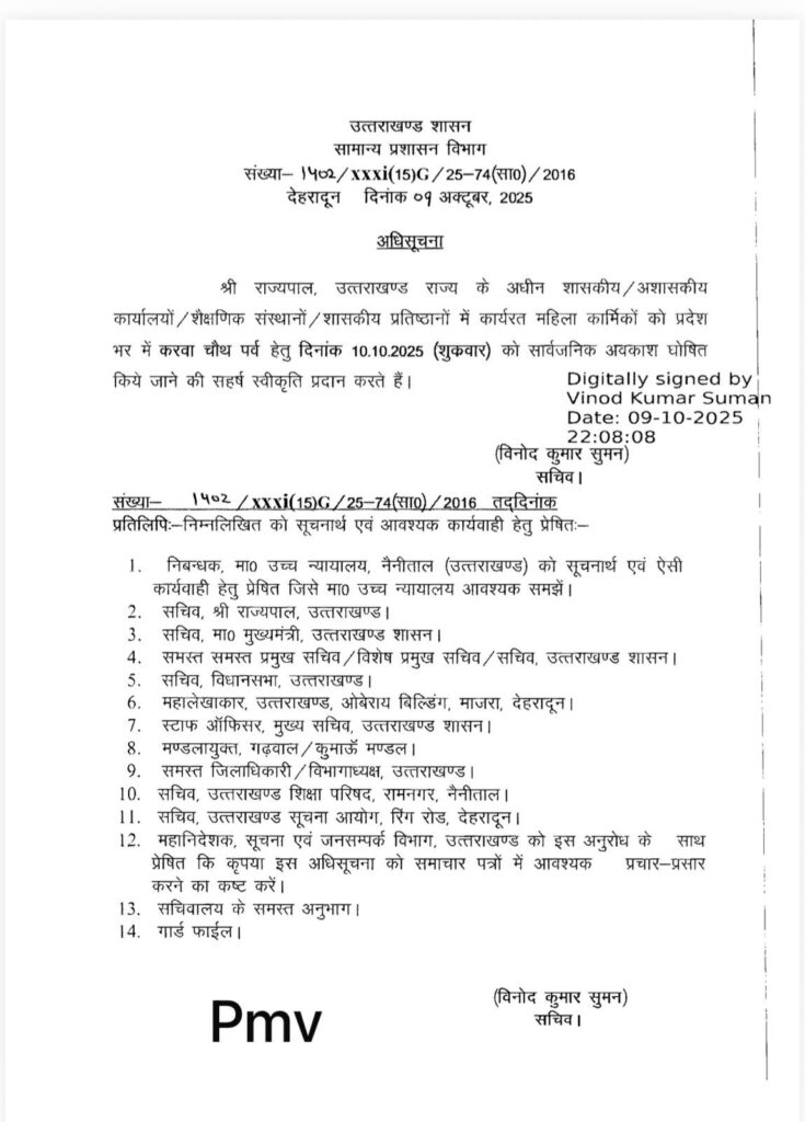 करवाचौथ पर सरकार के इस फैसले से प्रदेशभर की महिला कर्मचारियों में खुशी की लहर दौड़ गई है। कई महिला संगठनों ने मुख्यमंत्री धामी का आभार जताते हुए कहा कि यह निर्णय महिलाओं के पारंपरिक उत्सवों के सम्मान और संवेदनशील शासन की पहचान है। राज्यभर के स्कूल-कॉलेजों और दफ्तरों में कार्यरत महिला कर्मियों को अब शुक्रवार को करवाचौथ का व्रत पूरे विधि-विधान और पारिवारिक माहौल में मनाने का अवसर मिलेगा।