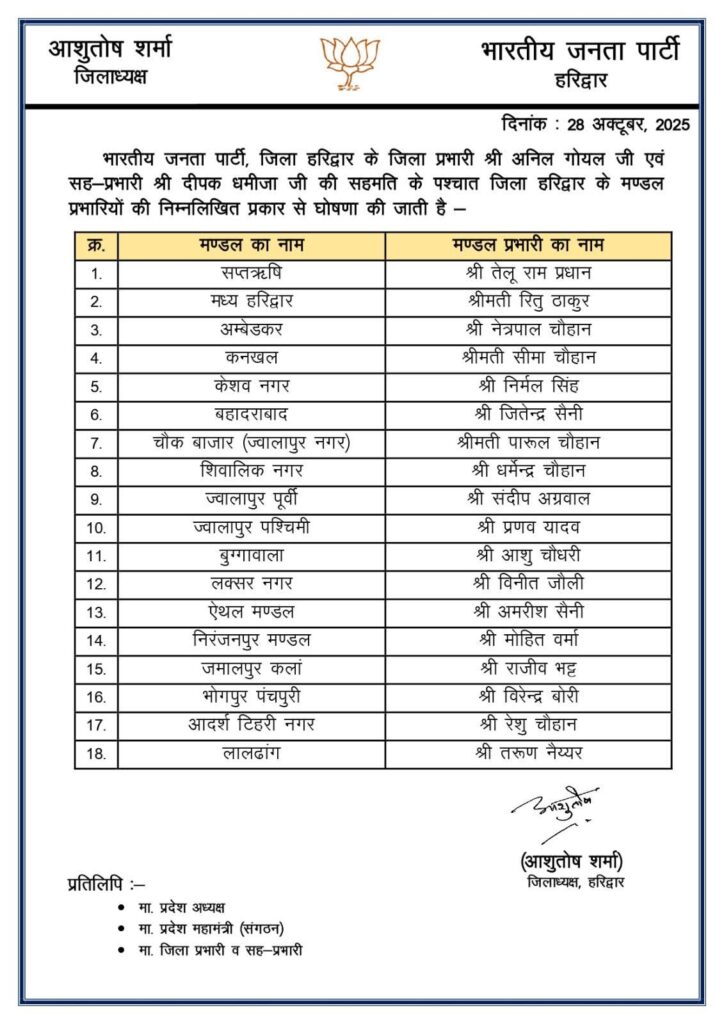हरिद्वार, 28 अक्टूबर 2025। भारतीय जनता पार्टी, जिला हरिद्वार में संगठनात्मक मजबूती के लिए नए मंडल प्रभारियों की घोषणा कर दी गई है। भाजपा जिला अध्यक्ष आशुतोष शर्मा ने यह घोषणा जिला प्रभारी अनिल गोयल एवं सह प्रभारी दीपक धमीजा की सहमति से की। आशुतोष शर्मा ने कहा कि पार्टी संगठन ही भाजपा की शक्ति है, और मंडल स्तर पर सशक्त टीम ही जनता से सीधा संवाद स्थापित करने का माध्यम बनती है। उन्होंने बताया कि संगठन में अनुभव, समर्पण और कार्यशीलता को प्राथमिकता देते हुए हर मंडल में जिम्मेदार कार्यकर्ताओं को दायित्व सौंपा गया है। आशुतोष शर्मा ने उम्मीद जताई कि सभी मंडल प्रभारी संगठन को और अधिक मजबूत करेंगे तथा आगामी चुनावों में भाजपा को विजय दिलाने में अग्रणी भूमिका निभाएंगे।