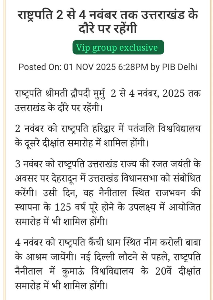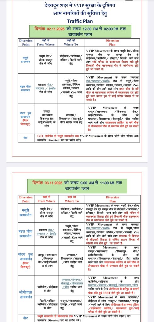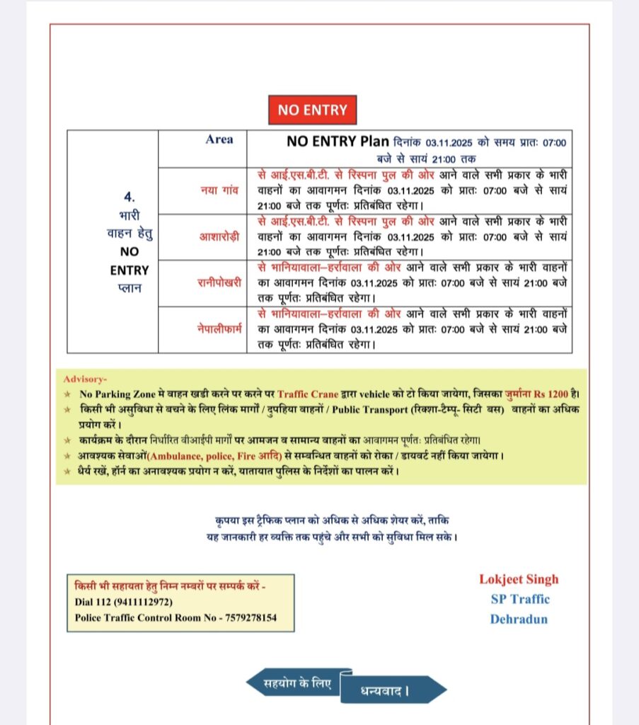 1.दिनांक 02.11.2025 को समय प्रातः 06ः00 बजे से हाईवे पर समस्त प्रकार के भारी वाहनों का आवागमन वीवीआईपी कार्यक्रम समाप्ति तक पूर्णतः प्रतिबन्धित रहेगा।