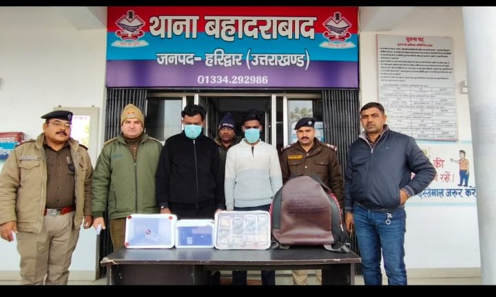 हरिद्वार, संवाददाता। बहादराबाद थाना पुलिस ने बहादराबाद स्थित पतंजलि रिसर्च सेंटर के पास सेल्समैन से हुई लूट की वारदात का खुलासा कर दिया है। लूट की वारदात को अंजाम देने वाले दो बदमाशों को भी पुलिस ने गिरफ्तार किया है। गिरफ्तार आरोपियों के नाम श्रवण गिरि पुत्र रमेश गिरि निवासी ग्राम दुगचाडा थाना देवबंद जिला सहारनपुर, हाल निवासी दौलतपुर बहादराबाद हरिद्वार और प्रणव पुत्र सुभाष सैनी निवासी ग्राम धनौरा थाना पिरान कलियर जिला सहारनपुर उ०प्र० हैं। आरोपियों के कब्जे से 04 लाख 06 हजार की नकदी, वारदात में प्रयुक्त चोरी की बाइक और तमंचा व जिंदा कारतूस भी बरामद किया है। दोनों आरोपियों के खिलाफ कई आपराधिक मुकदमे दर्ज हैं। अय्याश शौक पूरा करने के लिए दोनों आरोपी लूट की वारदात को अंजाम देते हैं। इस वारदात में शामिल दो आरोपी अभी पुलिस के हत्थे नहीं चढ़े हैं, दोनों की गिरफ्तारी के प्रयास जारी हैं।