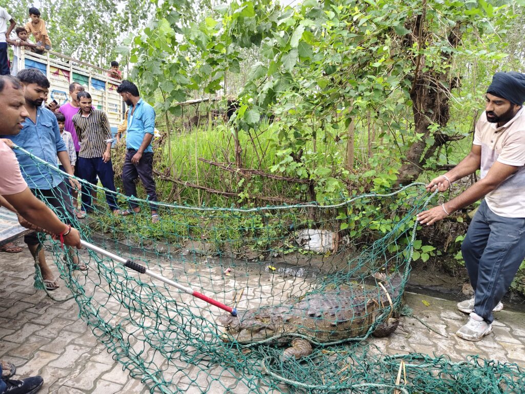 लक्सर क्षेत्र के महाराजपुर कला गांव की है। यहां जसवीर सिंह पुत्र शेर सिंह के घर के पास खेतों में एक विशालकाय मगरमच्छ दिखाई देने से ग्रामीणों में अफरा-तफरी मच गई। विशालकाय मगरमच्छ करीब ढाई कुंतल वजनी था। तत्काल इसकी सूचना लक्सर वन विभाग की टीम को दी गई। सूचना पर गुरजंट सिंह और सुमित सैनी टीम मौके पर पहुंची और ग्रामीणों की भीड़ को नियंत्रित करते हुए मगरमच्छ को पकड़ने का अभियान शुरू किया। कई बार के प्रयास और मशक्कत के बाद वनकर्मियों ने मगरमच्छ को सुरक्षित पकड़ लिया। इसके बाद उसे उसके प्राकृतिक वास स्थल में छोड़ दिया गया।