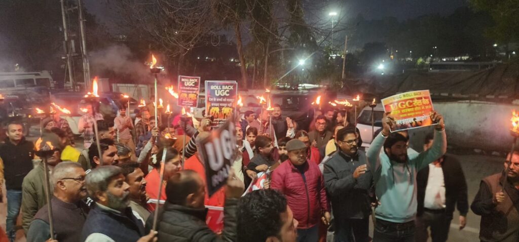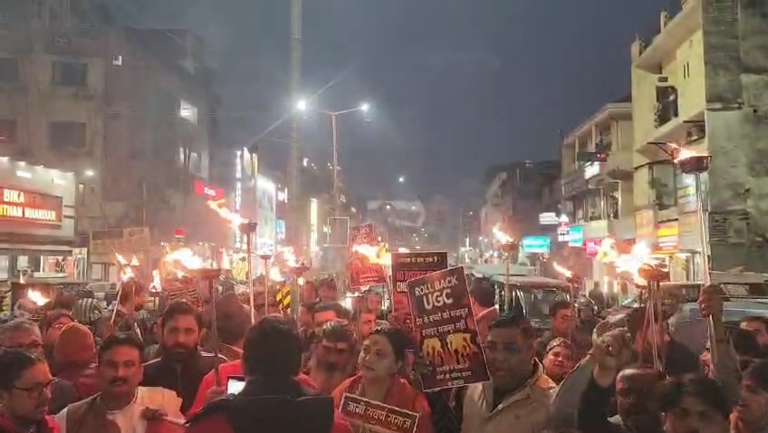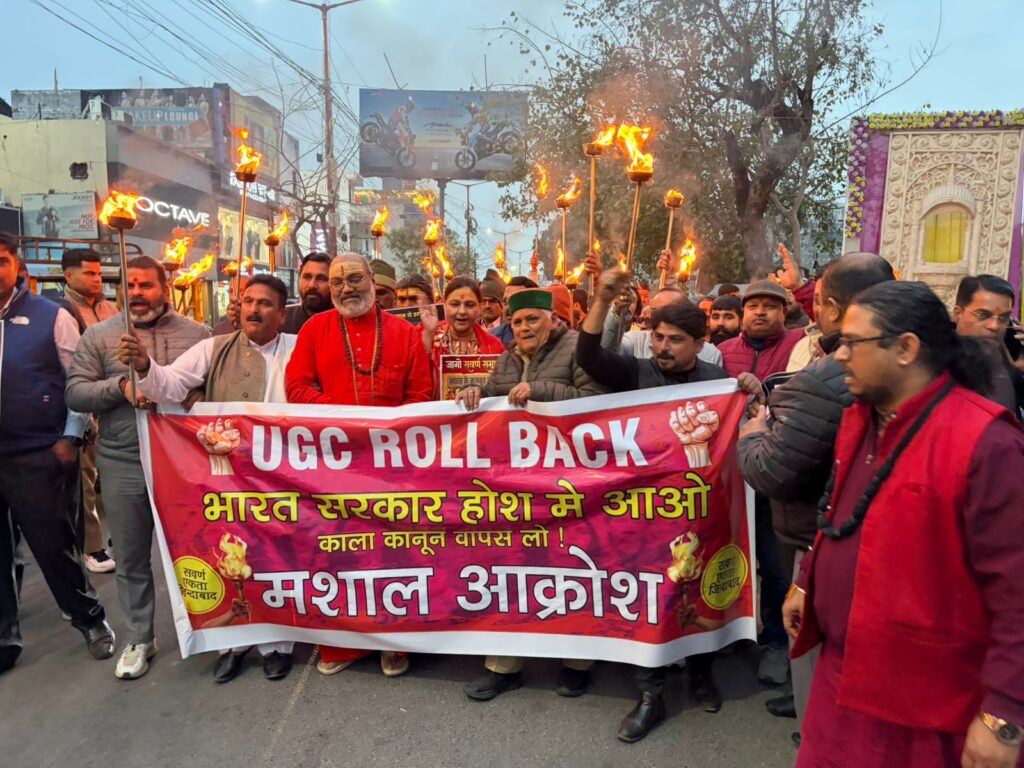 हरिद्वार, 18 फरवरी। हरिद्वार में अखंड परशुराम अखाड़े के नेतृत्व में सवर्ण समाज के लोगों ने यूजीसी से जुड़े नए प्रावधानों के विरोध में मशाल जुलूस निकालकर प्रदर्शन किया। जूना अखाड़े के महामंडलेश्वर और डासना पीठाधीश्वर यति नरसिम्हानंद गिरी समेत सैकड़ों लोगों ने हाथों में मशाल लेकर खन्ना नगर से लेकर ऋषिकुल मैदान तक जुलूस निकाला और सरकार के खिलाफ नारेबाजी कर कानून वापस लेने की मांग उठाई। साथ ही आगामी आठ मार्च को दिल्ली के रामलीला मैदान में प्रस्तावित सभा में बड़ी संख्या में पहुंचने का आह्वान भी किया।